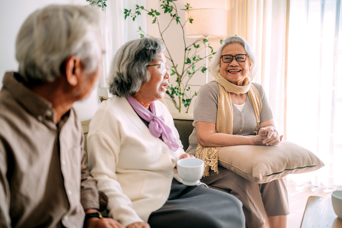 A group of older people sitting and talking.